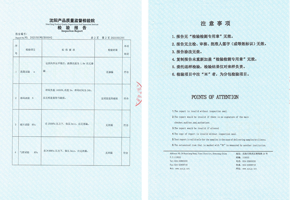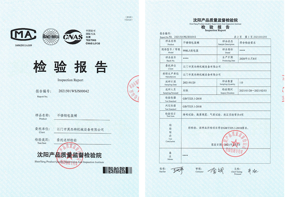 全部采用不锈钢SUS304,包装桶内无卫生死角。内表面电解抛光,外表面镜面抛光,效果达到8K。根据客户要求刻印编号等内容。包装桶设计压力0.6MP,设计温度80C。检测压力0.35MP,时间>4小时。