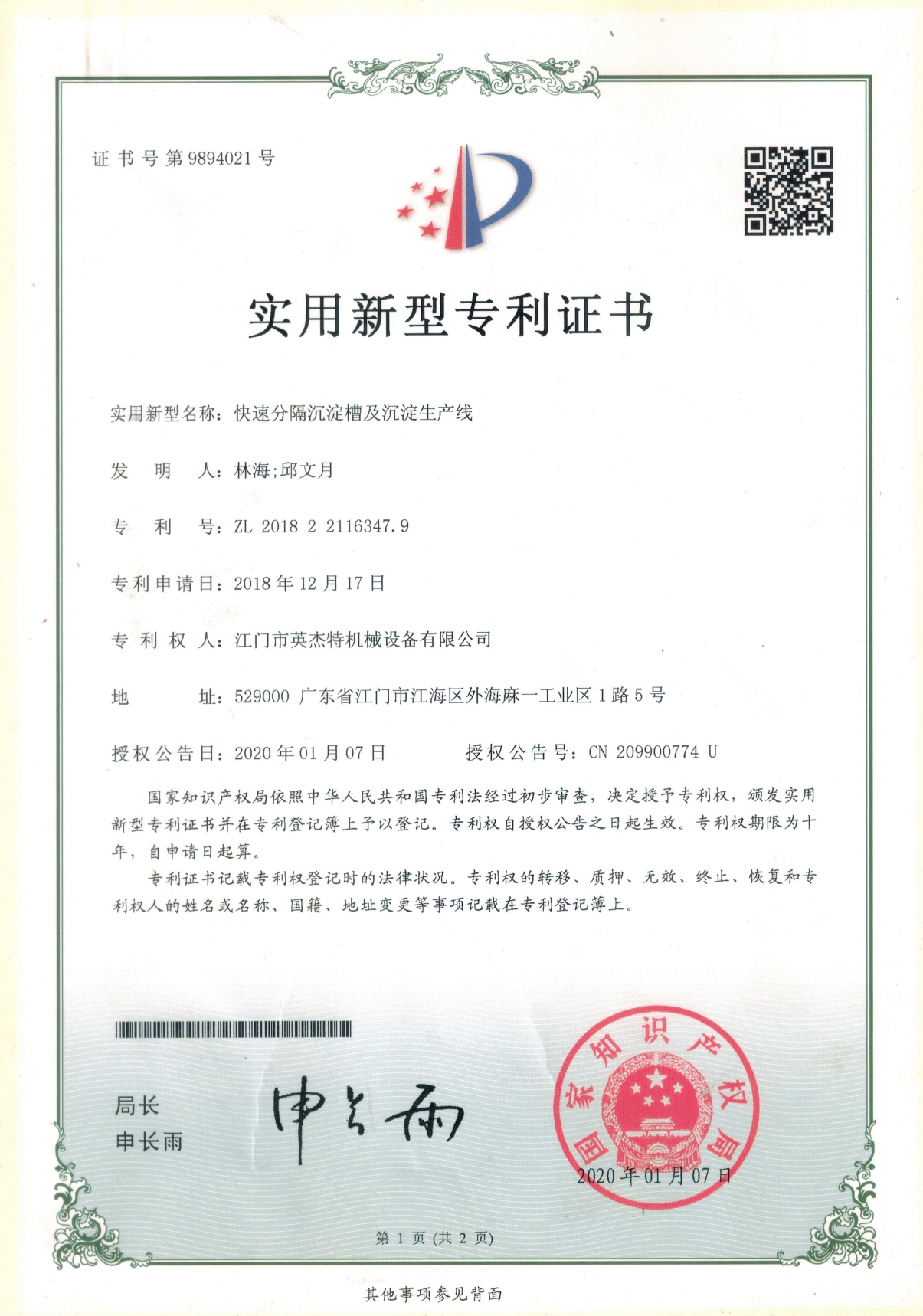 沉淀槽及生产线专利证书