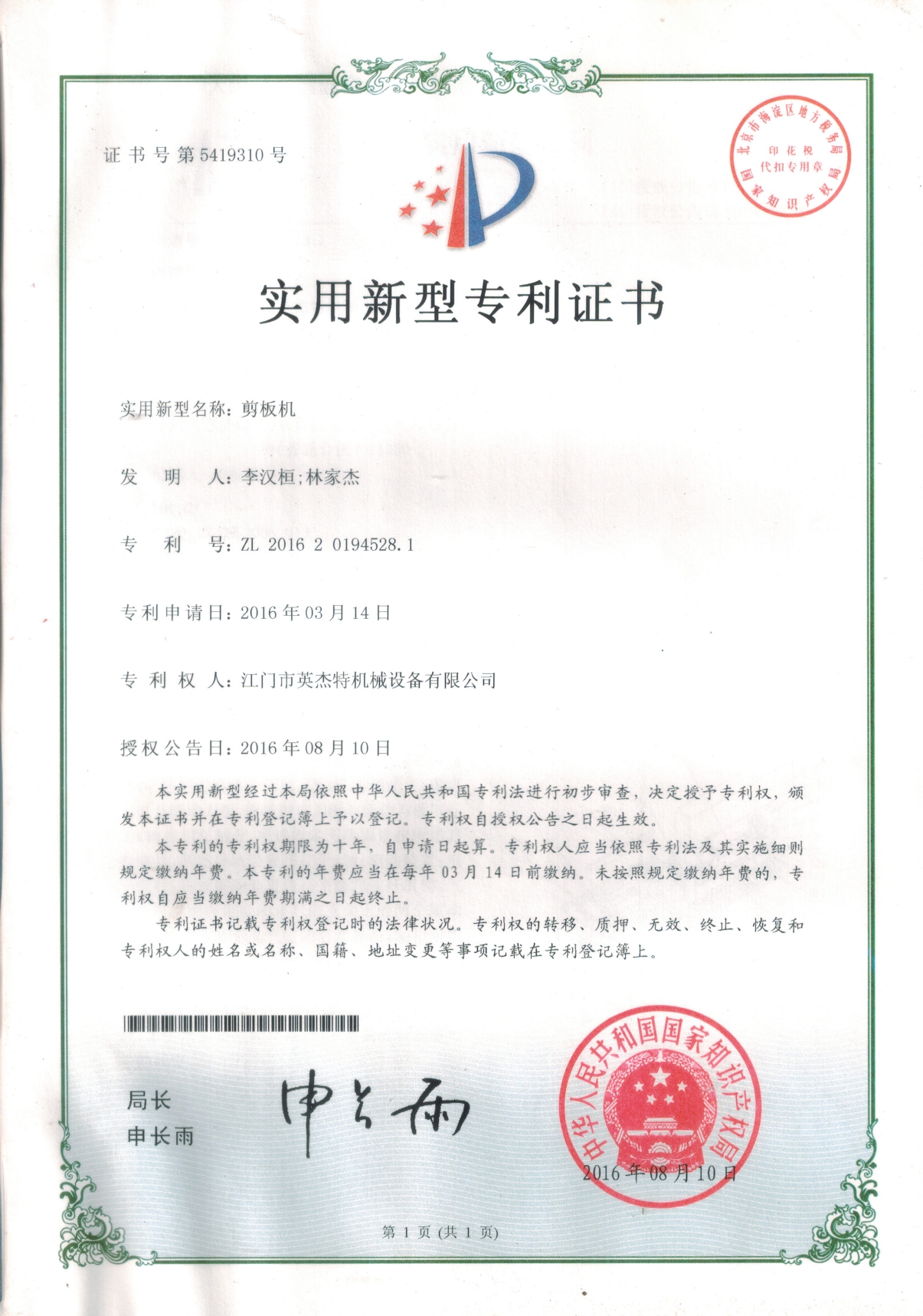 剪板机专利证书